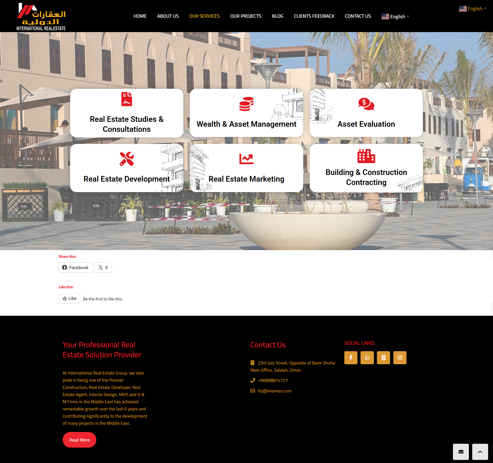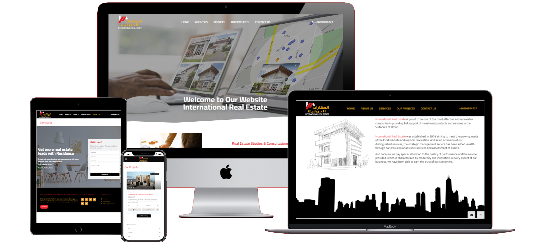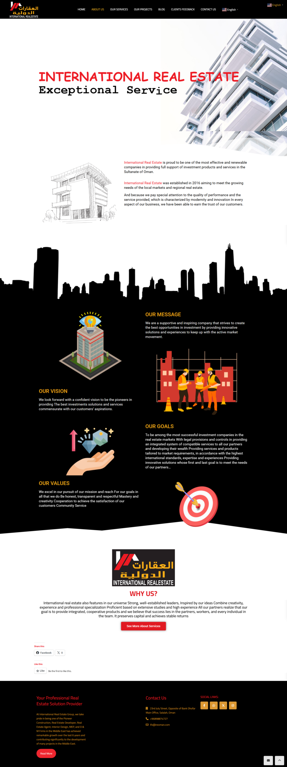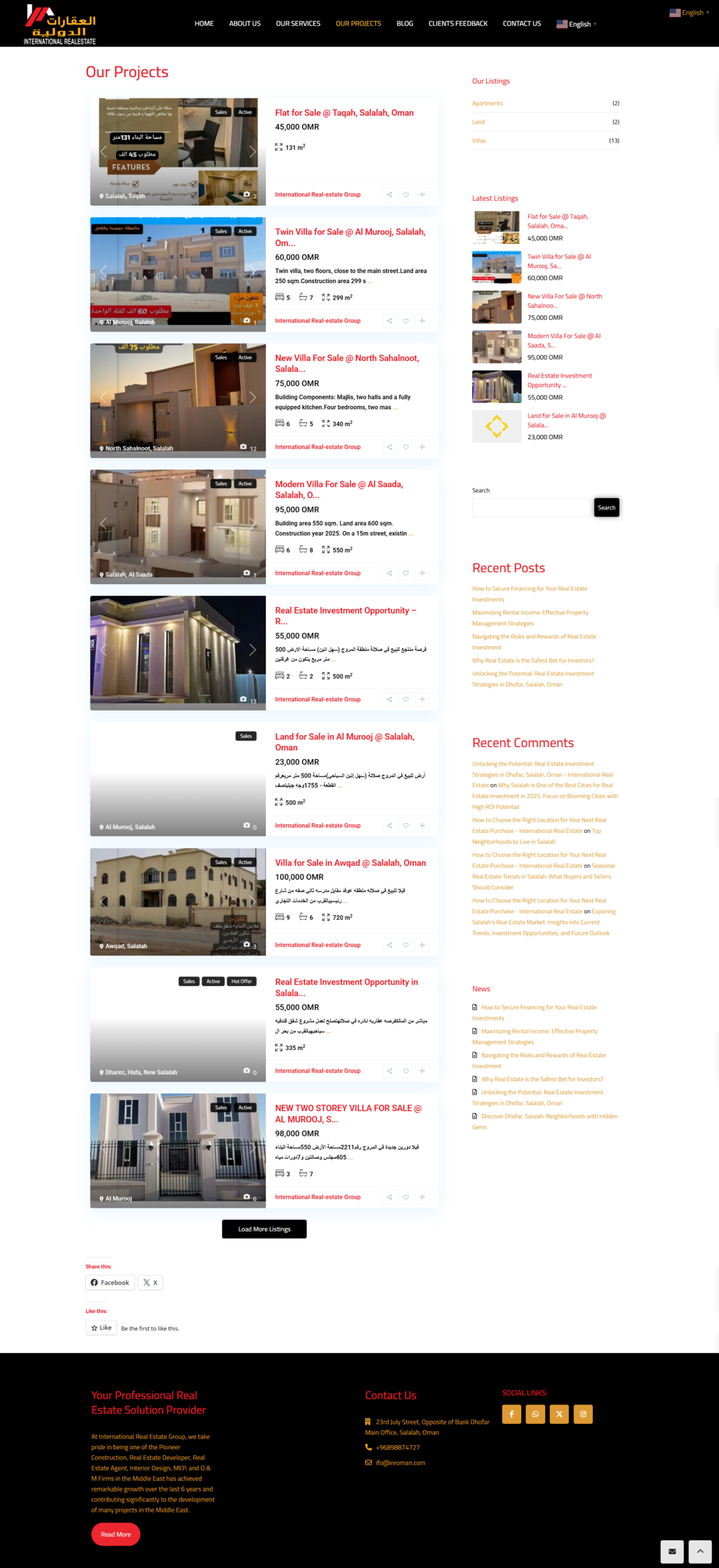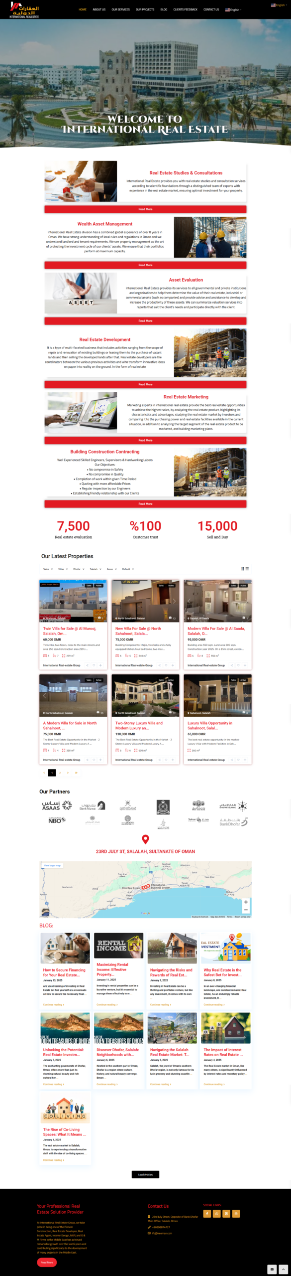 العقارات الدولية بكونها واحدة من أكثر الشركات فعالية واستدامة في تقديم الدعم الكامل للمنتجات والخدمات الاستثمارية في سلطنة عمان، قمنا بتصميم وبرمجة المنصة لتستعرض خدماتها والعقارات بطريقة مميزة وفعالة